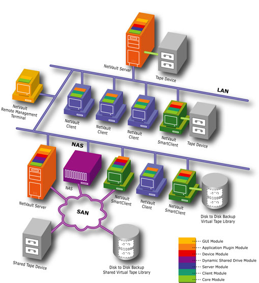 Pokrytí DAS/SAN/NAS. NetVault podporuje téměř všechny typy páskových zařízení, autoloaderů a knihoven na současném trhu, včetně posledních technologií LTO 3 a SDLT 600. Zálohu lze použít za předpokladu, že pásková jednotka je připojena k serveru prostřednictvím SCSI, Fiber Channel nebo iSCSI. Pro zařízení NAS je využito standardního protokolu NDMP.