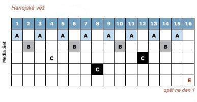 The backup starts on medium set ‘A’ and then it continues every other day. The next backup takes place on medium set ‘B’ (but not on the day of medium set ‘A’ backup) and then it repeats every fourth backup. Medium set ‘C’ starts not on the day of ‘A’ and ‘B’ backups and repeats every eighth backup. The policy of D and E Sets is adjusted this way. The first backup does not start on the day of A, B or C Sets backup and repeats every sixteenth backup.